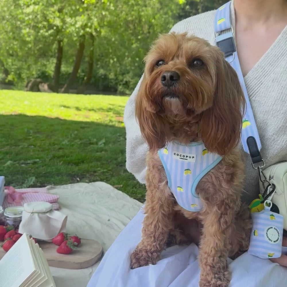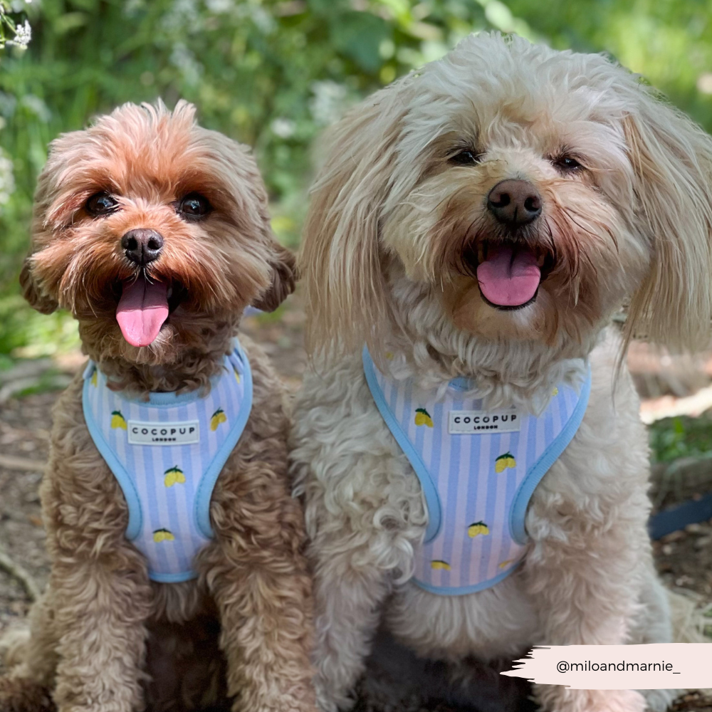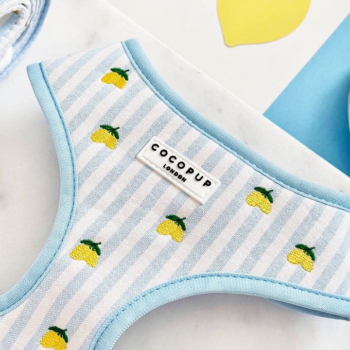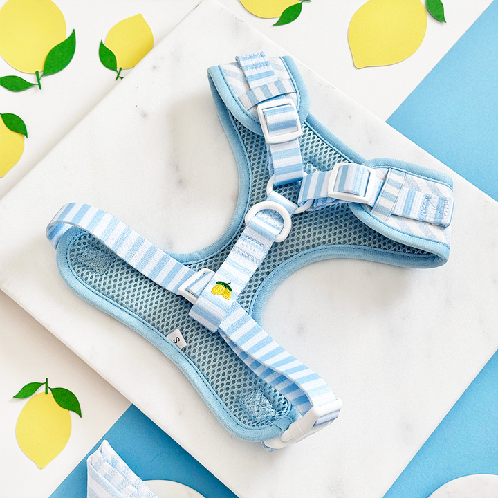 Get ready to walk your pup in style with our Living La Vida Lemon Adjustable Neck Harness! Featuring fun embroidered lemons and a playful blue and white striped design, this harness is perfect for summer walks. Plus, with a safety lock on the buckle, you can ensure your dog's safety while adding a pop of citrus to their wardrobe.