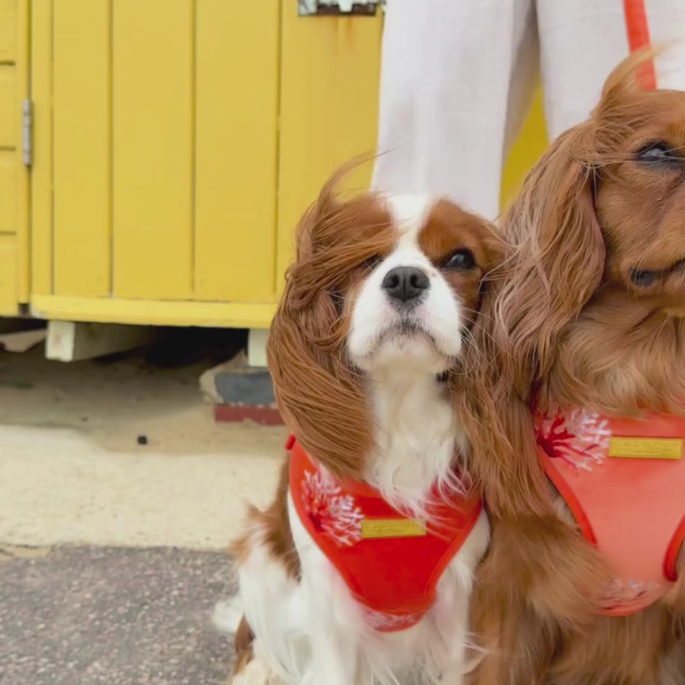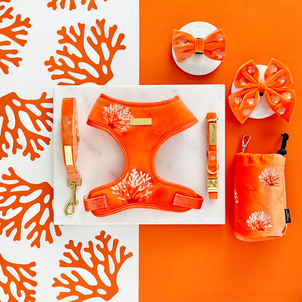 Keep your pup stylish and safe with our Luxe Velvet Adjustable Neck Harness in Coral Core! Perfect for summertime beach adventures or sunset dog walks. The embroidered design and gold hardware adds a unique touch.