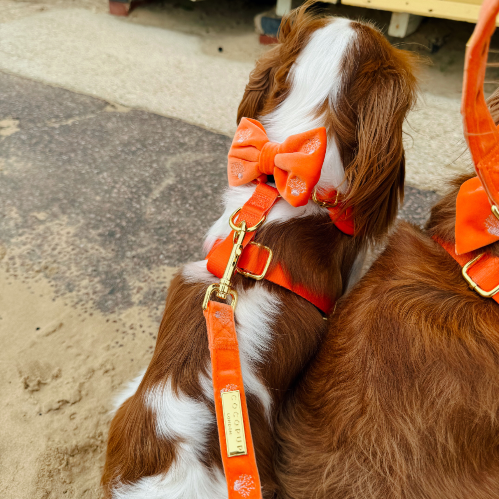 Take your pup on a stylish beach adventure with our Luxe Velvet Bow Tie in Coral Core. Perfect for sunset walks and summer days, this embroidered bow tie adds a playful touch to any dog's accessory collection.