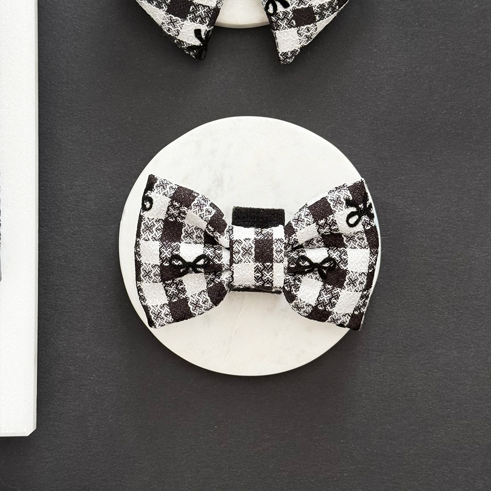 Introducing our Pup in Paris Bow Tie! This stylish accessory features a black and white checked design adorned with embroidered bows. Perfect for a chic dog walk in the city!