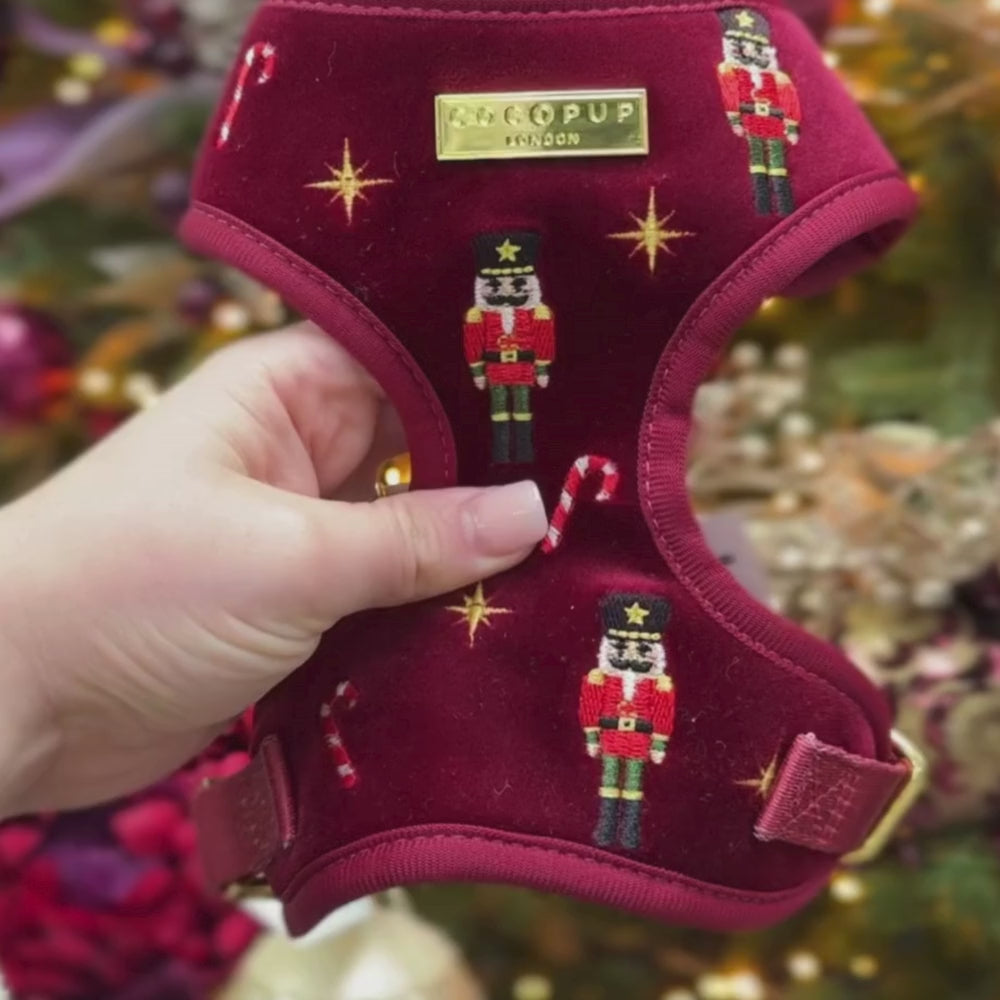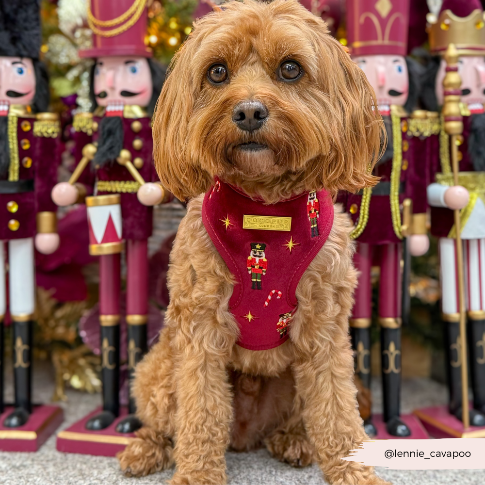 Add festive cheer to your dog's daily stroll with The Muttcracker Adjustable Neck Harness. Made from plush red velvet and adorned with a charming embroidered Christmas Nutcrackers, it brings holiday spirit to every walk. The gold hardware ensures a secure, comfortable fit while making your dog the star of the season. Perfect for spreading joy and style on chilly winter outings!