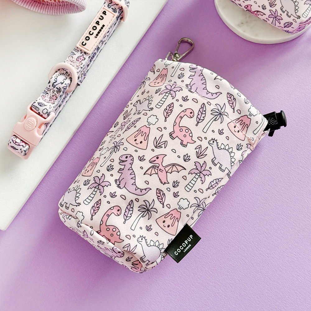 Take your dog walks to the next level with this lilac Dino-mite drawstring treat pouch! Conveniently store treats for training while on adventures with your pup. Cute and quirky, just like your furry friend!
