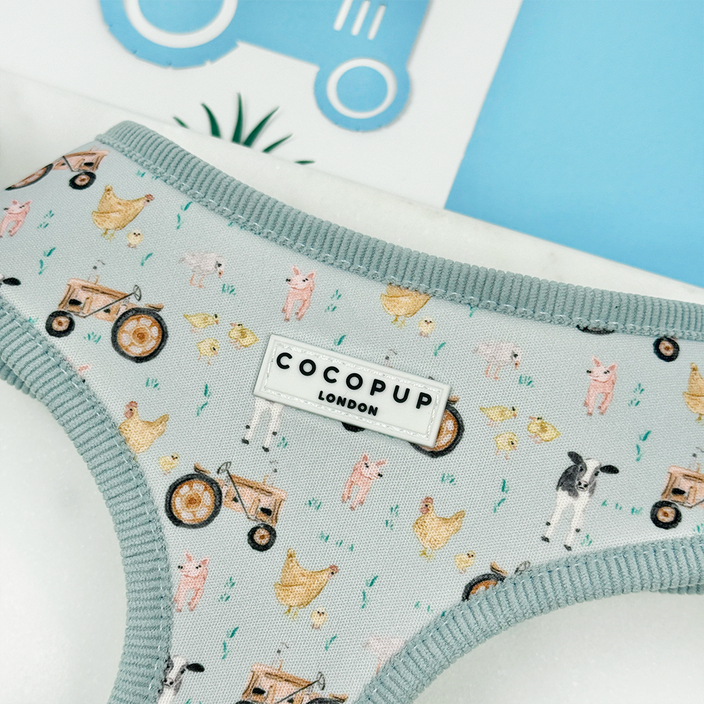 Introduce your farm loving pup to countryside charm with our Barnyard Buddies Adjustable Neck Harness. Featuring a delightful farmyard design complete with tractors, cows, pigs, ducks, and chickens in cheerful blue tones, this harness brings spring spirit to every dog walk. The adjustable fit grows with your furry friend, ensuring comfort and security whether you're exploring country lanes or enjoying pastoral adventures. Perfect for the dog who dreams of farm life!
