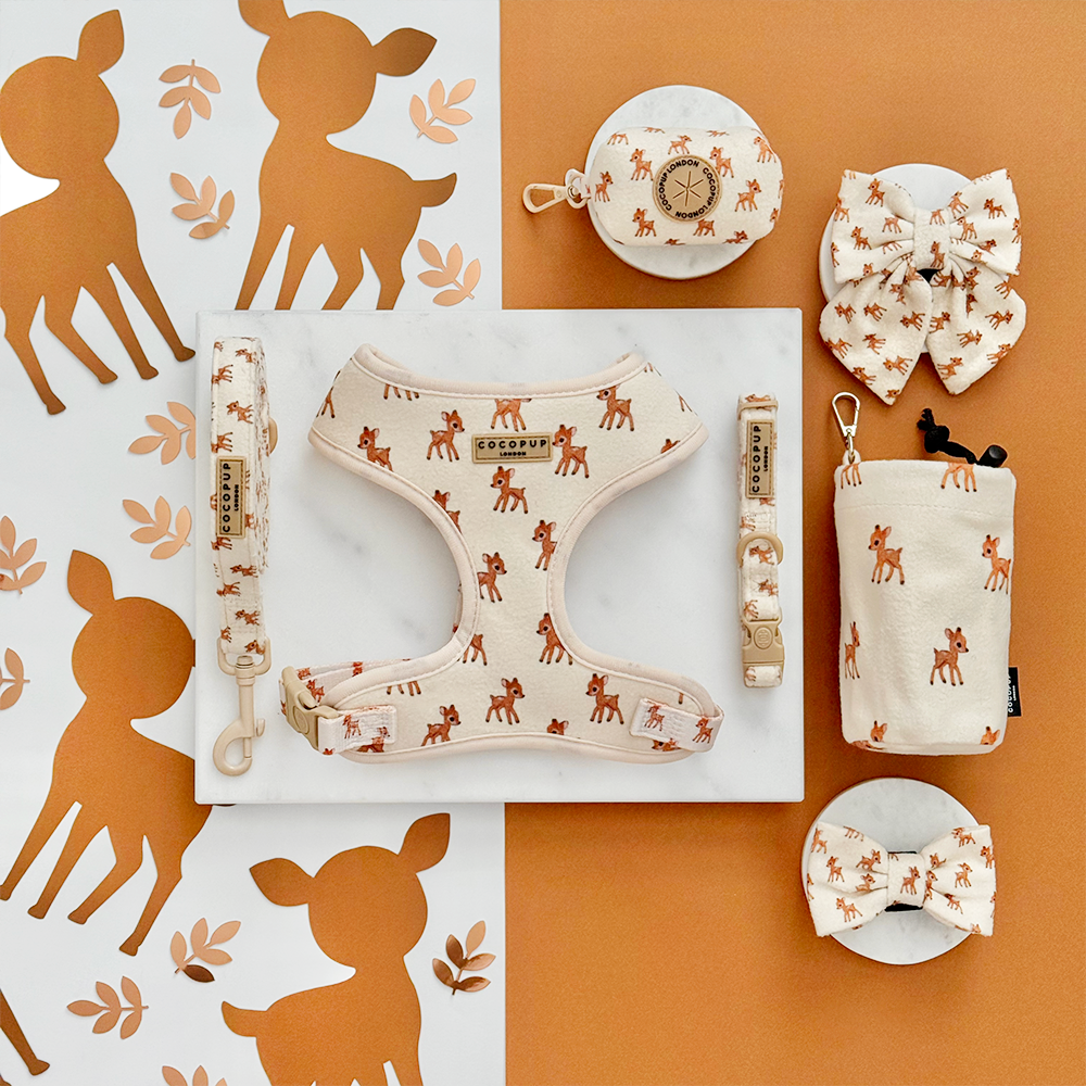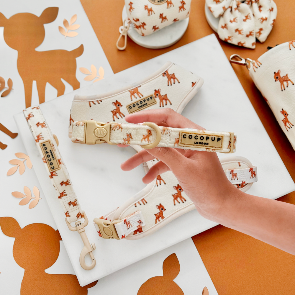Snuggle up your pup this autumn with the Fleecy Fawn Adjustable Neck Harness, Lead & Collar Bundle. Crafted from soft fleecy fabric, it keeps your dog warm during crisp walks. Featuring safety locks on both collar and harness buckle, it ensures secure adventures. Inspired by the charm of baby deer, this playful set adds a touch of woodland whimsy to every stroll. Perfect for happy, safe, and cosy outings!