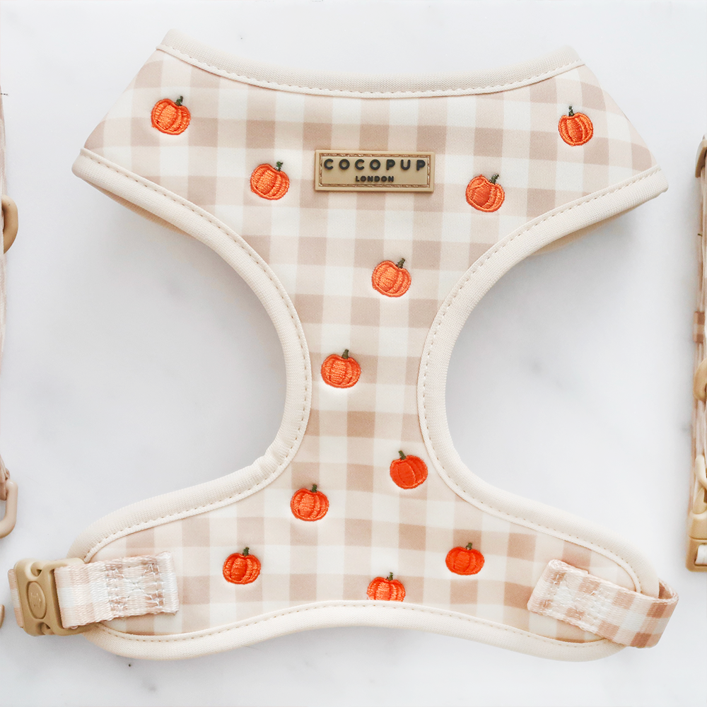 Keep your furry friend safe and stylish this autumn with the Pumpkin Patch Adjustable Neck Harness. Featuring a secure safety lock on the buckle, it ensures worry-free walks through crunchy leaves and pumpkin patches. The charming nude gingham fabric is adorned with adorable embroidered pumpkins. Adjustable for the perfect fit, this harness combines comfort and seasonal fun for your pup’s best fall adventures.