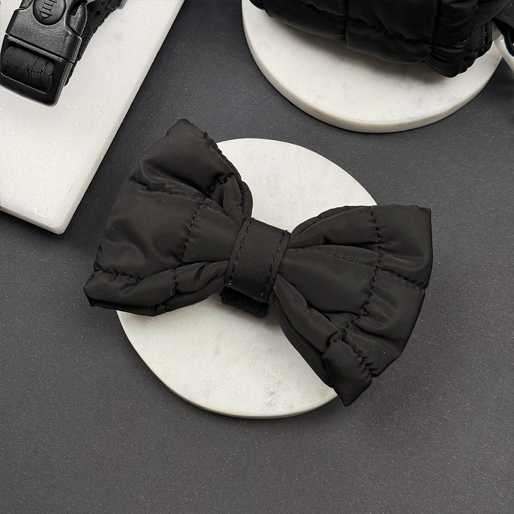 Make every dog walk a stylish adventure with the Quilted Onyx Bow Tie in chic black. This playful accessory perfectly complements your crossbody crescent dog walking bag, adding a dash of style to your furry friend's look.